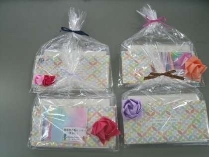 今日、赤おに青おに作業所から挿絵が採用された人に卓上カレンダーが届きました。きれいにラッピングされ、しかも折り紙で作られた花を添えて。卓上カレンダーは、紙をすいて作った手作りカレンダーで、そこに子供たちの絵がプリントされています。とても温かみを感じるカレンダーで、赤おに青おに作業所のみなさんから子供たちへの一足早いクリスマスプレゼントとなりました。