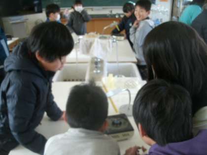 今日は、水のあたたまり方について学習しました。学習のめあて、実験の進め方を確認した後、早速班で協力して実験を進めていきました。水は無色透明なので、どのようにあたたまっているのかわかりません。そこで、サーモセンサーを使って実験しました。