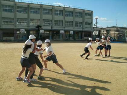 そのあと、タグラグビーに向けての基本的な練習をしました。友だちがつけているタグを取ろうと、必死に体を動かしていました。