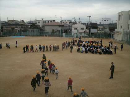地震発生を知らせる校内放送の後、子供たちは素早く机の下に潜り込み、身の安全を確保しました。そして、運動場に集合・整列しました。その後、津波に備えて、3階の教室に避難しました。