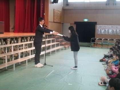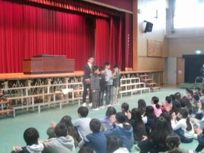 今日は運動場の状態が悪いので、体育館で全校朝会を行いました。6年生といっしょに全校朝会を行うことができるのも、今日を含めてあと2回。さみしい思いを抱きつつ、今日はうれしいお知らせがたくさんありました。