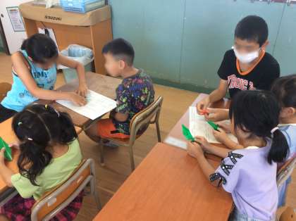 1・6年、2・5年、3・4年のペアで折り鶴を作りました。
