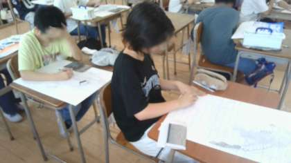 図工科の学習で「模写」をしています。日本の名画をじっくり見てていねいに描いています。