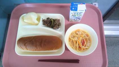9月3日(水)の給食は「黒糖パン・牛乳・牛肉の香味焼き・トマトのスープスパゲッティ・なし(二十世紀)」でした。