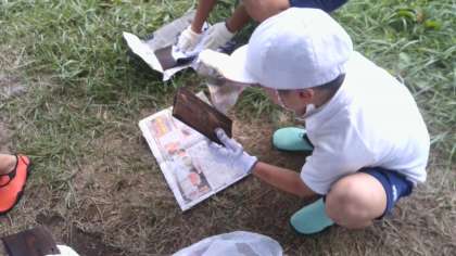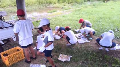 川原で焼き板を磨きました。2日目に、林間の思い出などを焼き板に描く予定です。