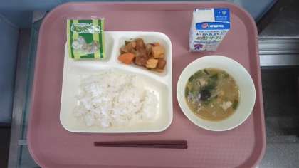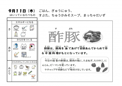9月11日(木)の給食は「ごはん・牛乳・酢豚・中華みそスープ・まっ茶大豆」でした。