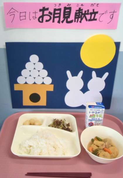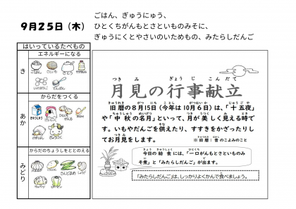 9月25日(木)の給食は月見の行事献立の「ごはん・牛乳・一口がんもとさといものみそ煮・牛肉と野菜のいためもの・みたらしだんご」でした。