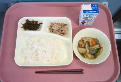 10月2日(木)の給食は「ごはん・牛乳・豚肉の梅風味焼き・ふきよせ煮・くきわかめのつくだ煮」でした。