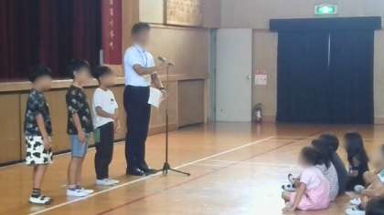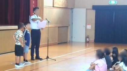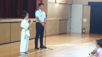 10月の児童朝会がありました。校長先生から、転入生の紹介、サッカーチームや空手の表彰、お話がありました。