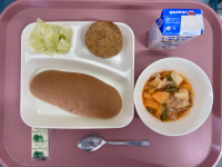 10月8日(水)の給食は「黒糖パン・牛乳・タンタンめん・キャベツの甘酢づけ・おさつチップス」でした。