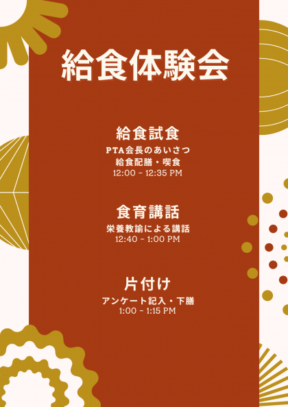 下記のとおりPTA給食体験会を開催いたします。日頃、子どもたちが食べている給食を体験していただき、家庭教育の一助になれば幸いです。