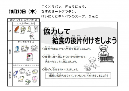 10月30日(木)の給食は「黒糖パン・牛乳・なすのミートグラタン・鶏肉とキャベツのスープ・りんご」でした。