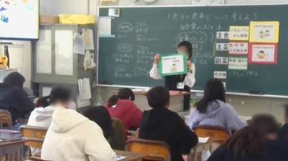 区の栄養教諭の先生に来ていただきました。主食・主菜・副菜などの食事を通して、三色食品群の赤・黄・緑の栄養バランスが大切なことについて学ぶことができました。