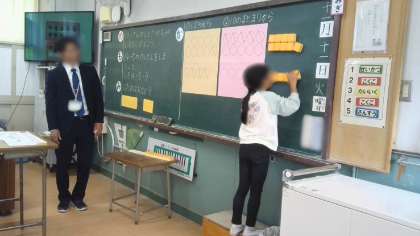 「ひきざん」の学習で、14−5の計算方法の違いについて考えました。生活科で取り組んでいる「やたパー」の内容を取り入れ、生活とのつながりを大切にしながら学習を進めました。ペアでブロックを操作したり、考え方を友だちと話し合ったりすることで、学びを深めることができました。