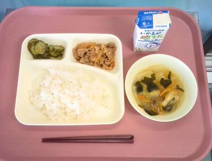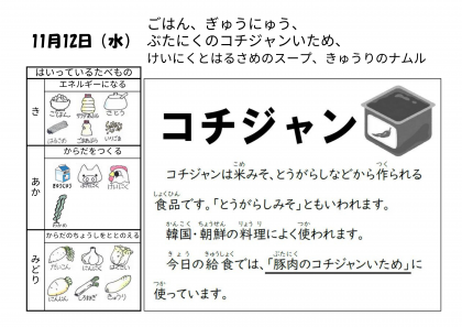 11月12日(水)の給食は「ごはん・牛乳・豚肉のコチジャンいため・鶏肉とはるさめのスープ・きゅうりのナムル」でした。