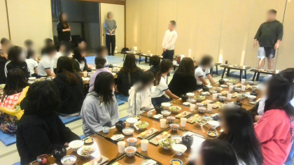 2日目も子どもたちは元気に朝を迎えました。朝の集いでは、近くの海岸まで歩き、ラジオ体操で体をしっかりと目覚めさせました。その後、朝ごはんをおいしくいただきました。
