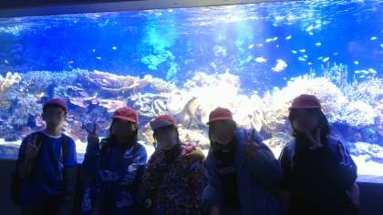志摩自然学校での体験を終えたあと、鳥羽水族館へ向かいました。鳥羽水族館では、昼食をとった後、活動班ごとに海の生き物を観察し、楽しい時間を過ごしました。