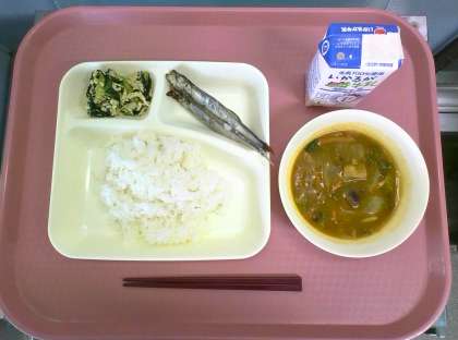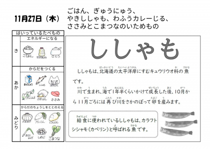 11月27日(木)の給食は「ごはん・牛乳・焼きししゃも・和風カレー汁・ささみとこまつなのいためもの」でした。