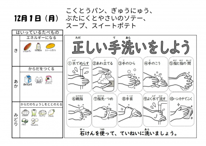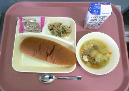 12月1日(月)の給食は「黒糖パン・牛乳・豚肉と野菜のソテー・スープ・スイートポテト」でした。