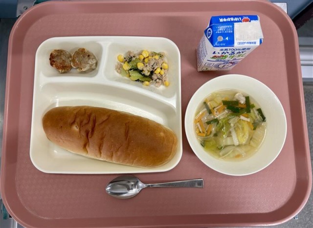 12月8日(月)の給食は「おさつパン・牛乳・焼きシューマイ・中華スープ・ツナとチンゲンサイのいためもの」でした。