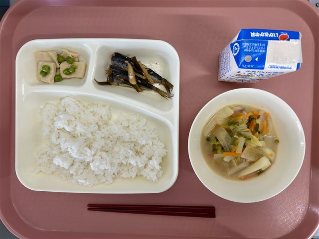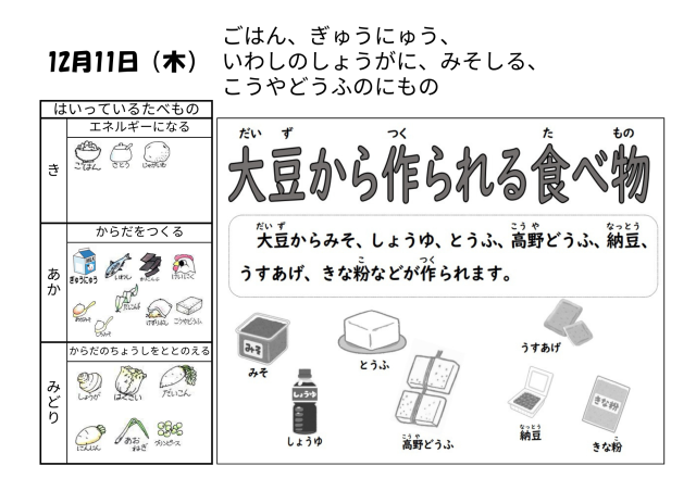 12月11日(木)の給食は「ごはん・牛乳・いわしのしょうが煮・みそ汁・高野どうふの煮もの」でした。