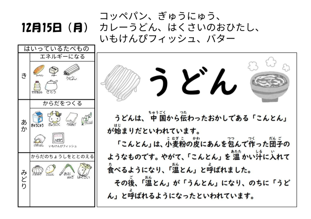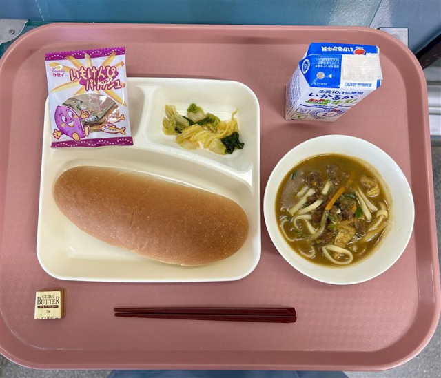 12月15日(月)の給食は「コッペパン・牛乳・カレーうどん・はくさいのおひたし・いもけんぴフィッシュ・バター」でした。