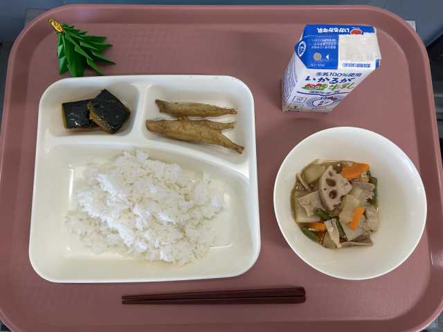 12月19日(金)の給食は「ごはん・牛乳・きびなごてんぷら・豚肉とあつあげの煮もの・焼きかぼちゃの甘みつかけ」でした。