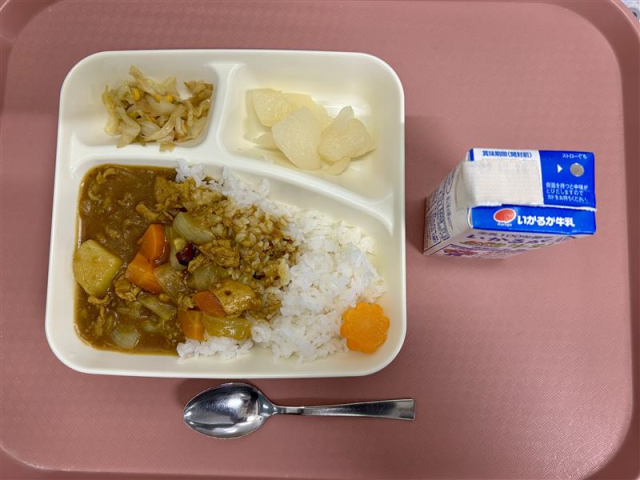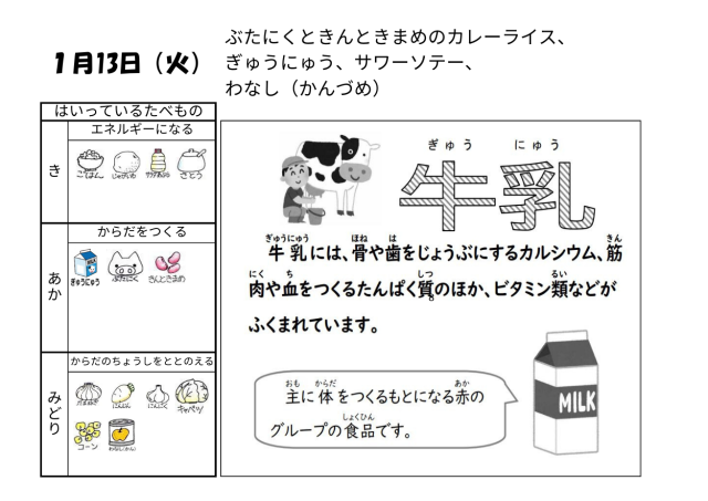1月13日(火)の給食は「豚肉と金時豆のカレーライス・牛乳・サワーソテー・和なし(カット缶)」でした。