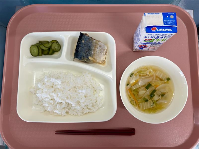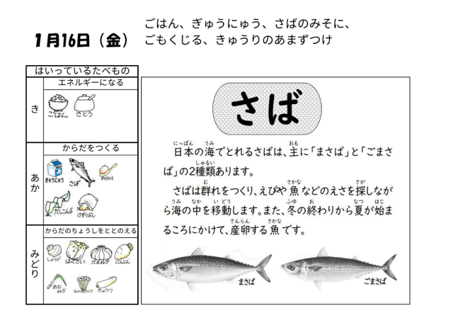 1月16日(金)の給食は「ごはん・牛乳・さばのみそ煮・五目汁・きゅうりの甘酢づけ」でした。