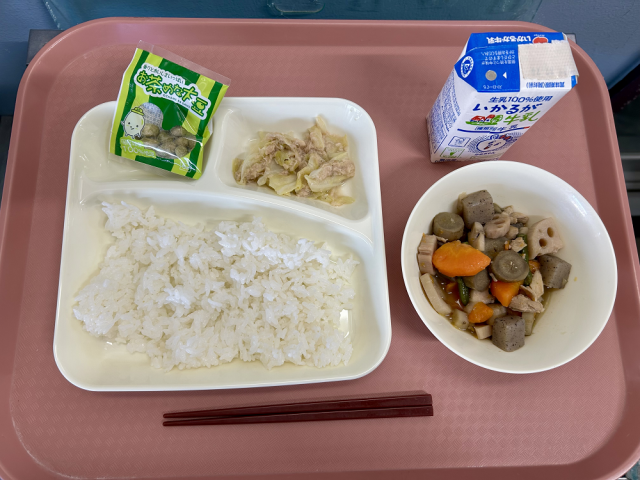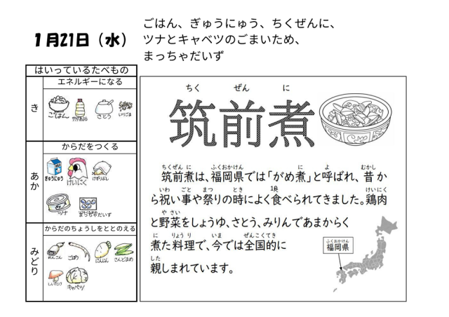 1月21日(水)の給食は「ごはん・牛乳・筑前煮・ツナとキャベツのごまいため・まっ茶大豆」でした。