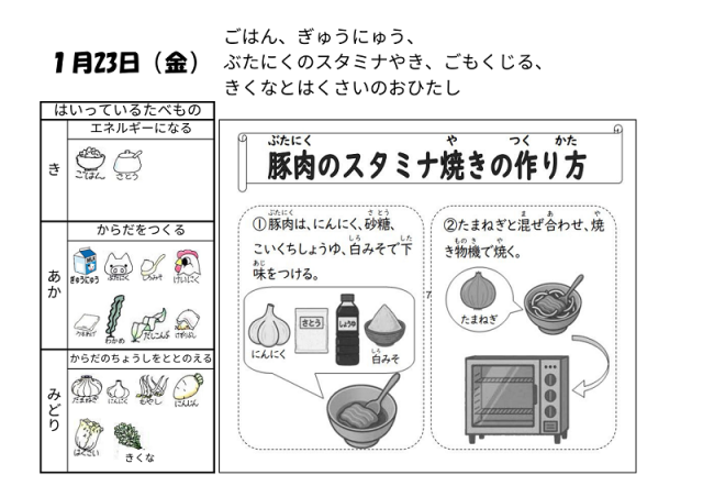 1月23日(金)の給食は「ごはん・牛乳・豚肉のスタミナ焼き・五目汁・きくなとはくさいのおひたし」でした。