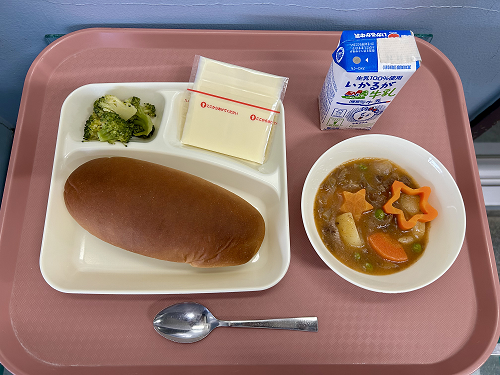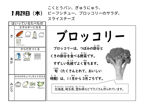 1月29日(木)の給食は「黒糖パン・牛乳・ビーフシチュー・ブロッコリーのサラダ・スライスチーズ」でした。