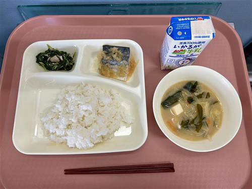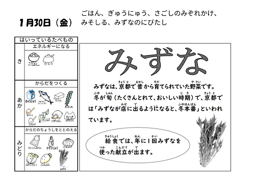 1月30日(金)の給食は「ごはん・牛乳・さごしのみぞれかけ・みそ汁・みずなの煮びたし」でした。