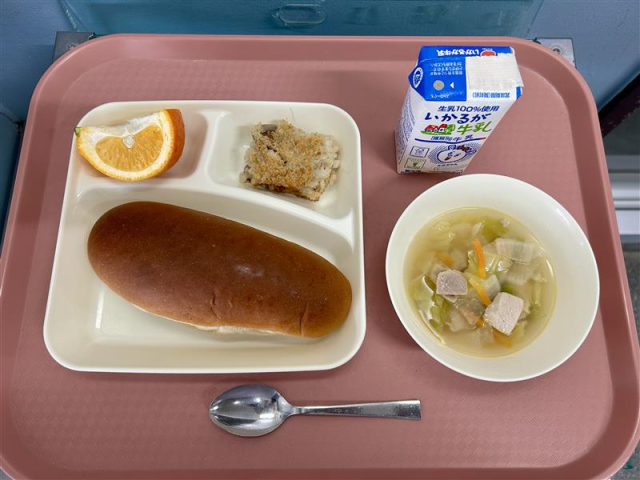 2月5日(木)の給食は「黒糖パン・牛乳・押麦のグラタン・スープ・いよかん」でした。