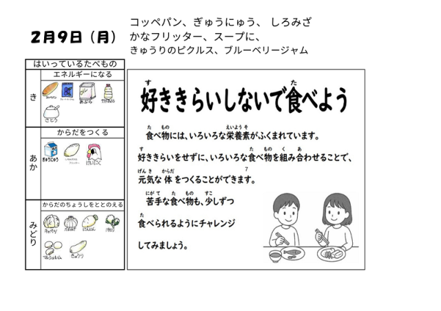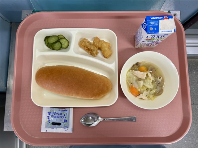 2月9日(月)の給食は「コッペパン・牛乳・白身魚フリッター・スープ煮・きゅうりのピクルス・ブルーベリージャム」でした。