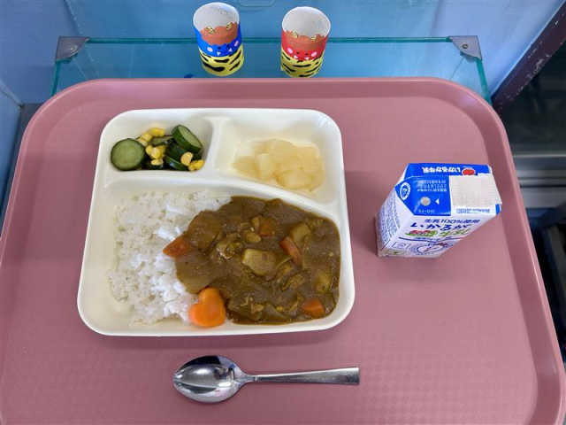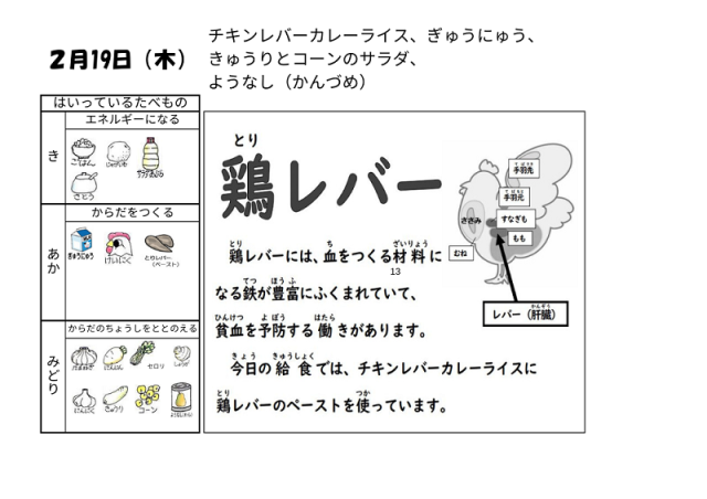 2月19日(木)の給食は「チキンレバーカレーライス・牛乳・きゅうりとコーンのサラダ・洋なし(かんつめ)」でした。