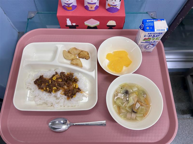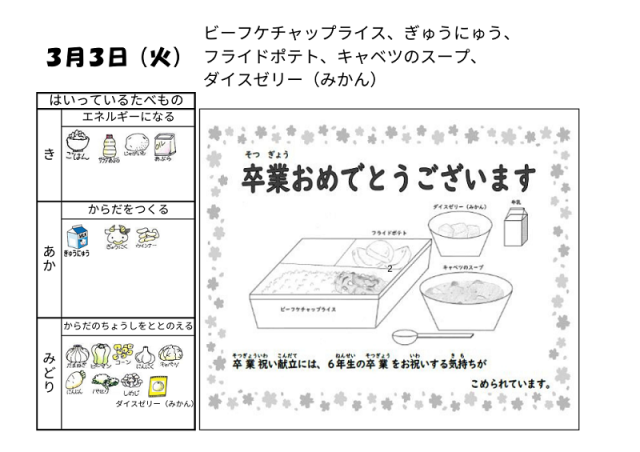 3月3日(火)の給食は卒業祝い献立の「ビーフケチャップライス・牛乳・フライドポテト・キャベツのスープ・ダイスゼリー(みかん)」でした。