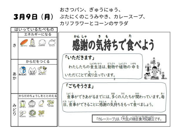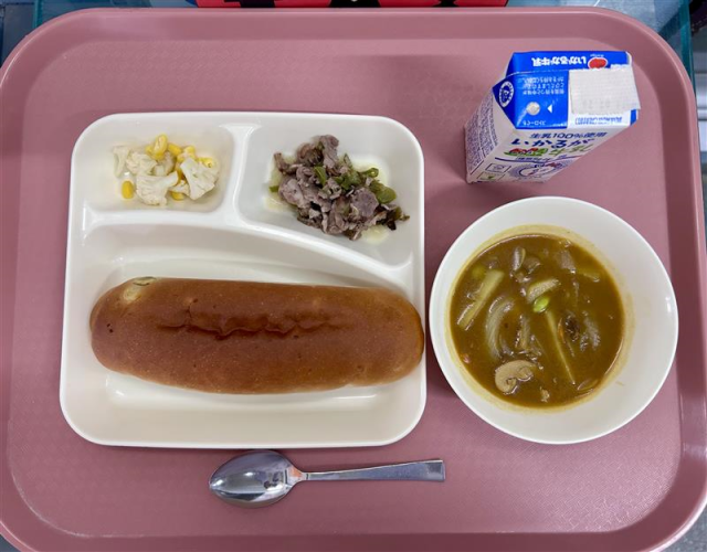 3月9日(月)の給食は「おさつパン・牛乳・豚肉の香味焼き・カレースープ・カリフラワーとコーンのサラダ」でした。