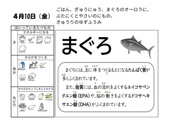 4月10日(金)の給食は「ごはん 牛乳 まぐろのオーロラ煮 豚肉と野菜の煮もの きゅうりのゆず風味」でした。