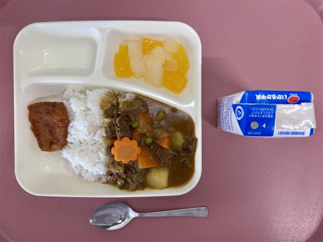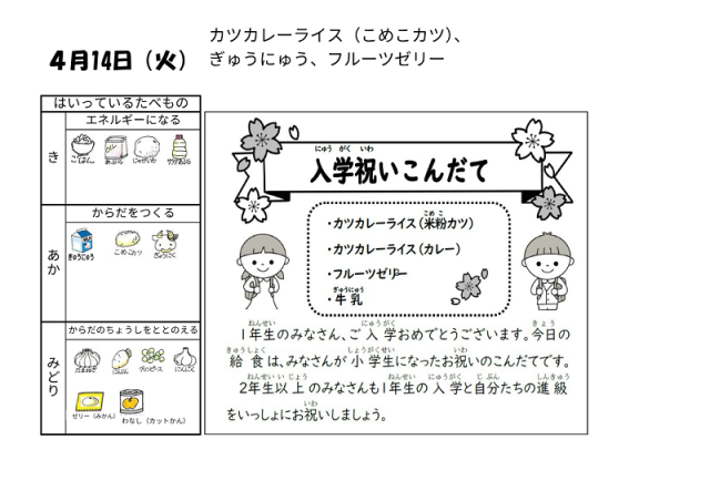 4月14日(火)の給食は入学祝い献立の「カツカレーライス(米粉カツ) 牛乳 フルーツゼリー」でした。