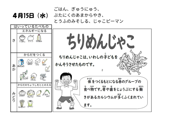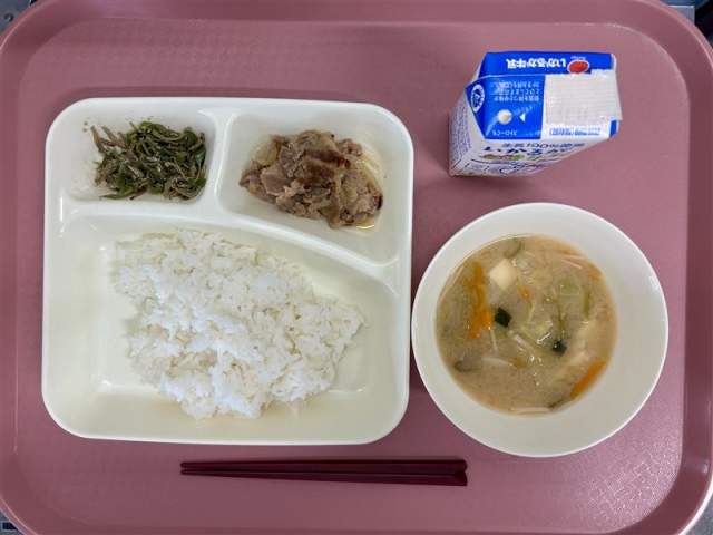 4月15日(水)の給食は「ごはん 牛乳 豚肉の甘辛焼き とうふのみそ汁 じゃこピーマン」でした。