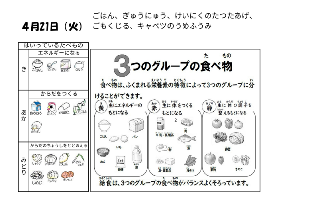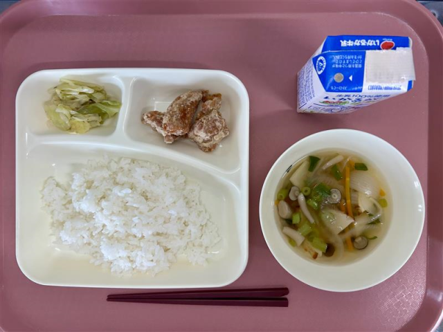 4月21日(火)の給食は「ごはん 牛乳 鶏肉のたつたあげ 五目汁 キャベツの梅風味」でした。