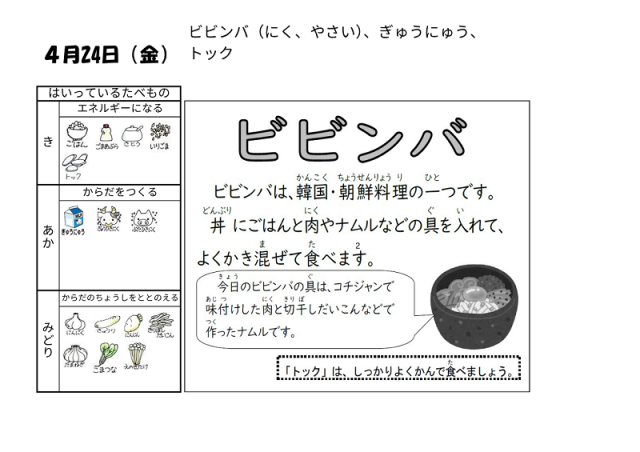 4月24日(金)の給食は「ビビンバ 牛乳 トック」でした。