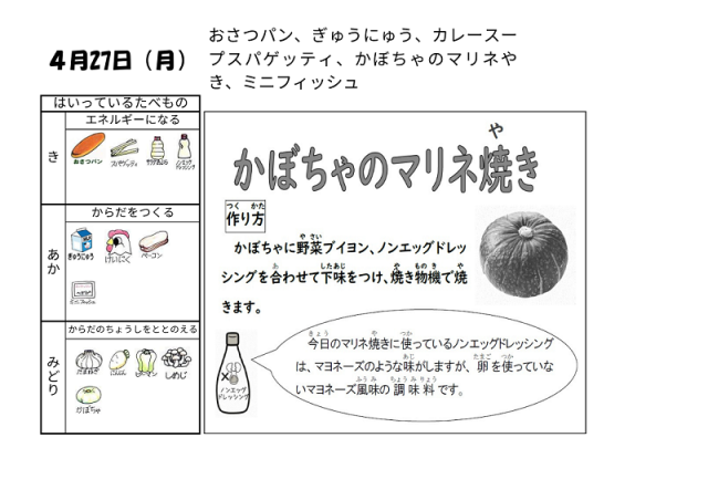 4月27日(月)の給食は「おさつパン 牛乳 カレースープスパゲッティ かぼちゃのマリネ焼き ミニフィッシュ」でした。
