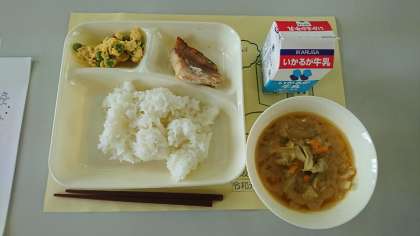 今日の献立は、みそ汁・赤魚のしょうゆだれかけ・えんどうの卵とじでした。
