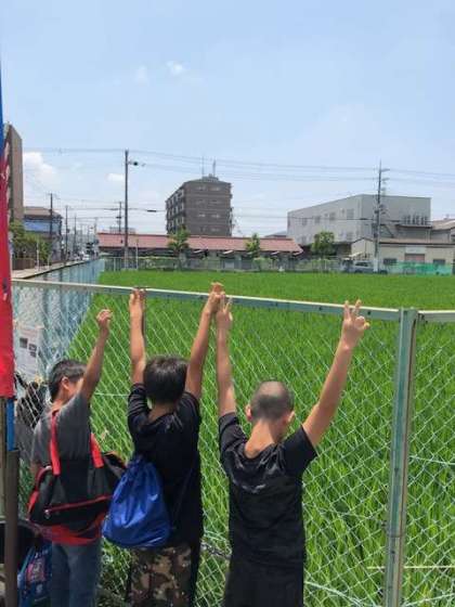 夏休みがはじまり、梅雨も明け、子どもたちは、元気いっぱい水泳や学習をがんばっています。学習帰りに子ども達と田んぼを見に行きました。大きく成長している稲を見て喜んでいました。白い花がいつ咲くのかと子どもたちが心待ちしていました。