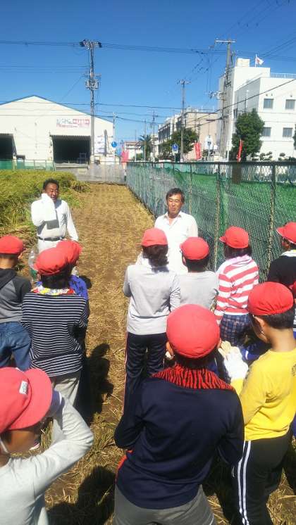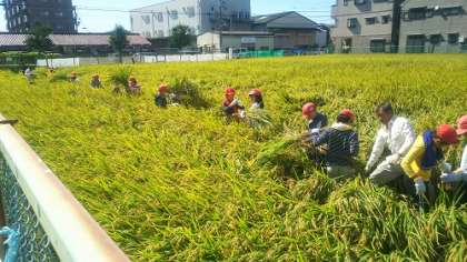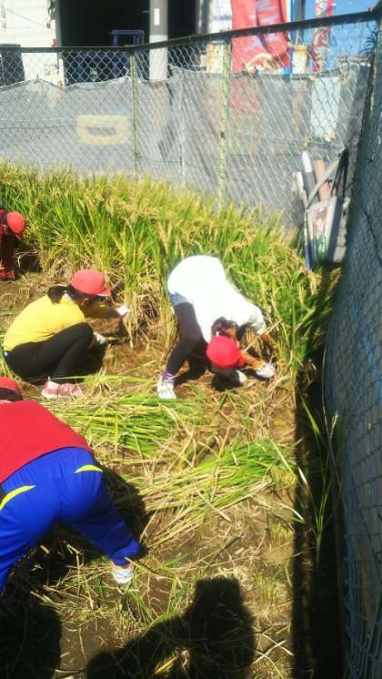 6月に田植え体験でお世話になった田中さんの田んぼで、稲刈り体験をさせていただきました。ずいぶんと成長した稲を刈っていく作業はかなり大変でしたが、その分あらためて食のありがたみや大切さを感じることができました。次は12月にとれたお米でご飯を炊いて「収穫祭」を行う予定です。