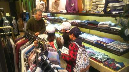 駒川商店街の見学に来ています。事前に考えてきた質問をするなど、お店の人たちにインタビューをしています。
