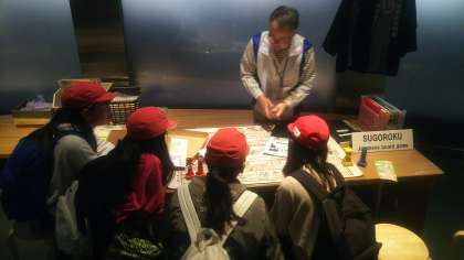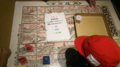 「大阪の名所すごろく」をしています。明治時代の大阪の名所を、すごろくをしながらクイズも交えて説明していただいています。