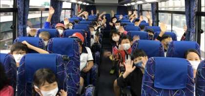 バスの中では、6年生からのサプライズムービーを見たり、歌を聴いたりして過ごしています。